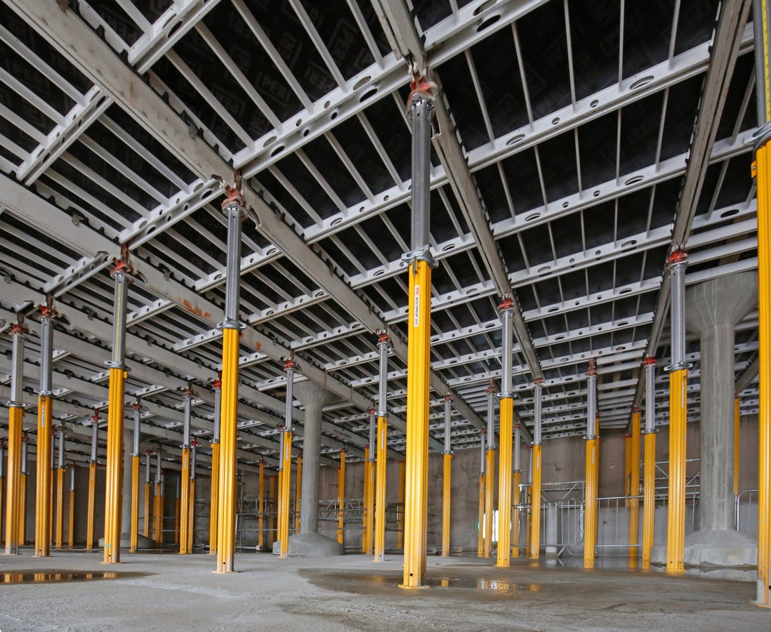 grâce au décoffrage anticipé de la tête de décintrement et au déploiement rapide des panneaux et des poutres à l’étage suivant.